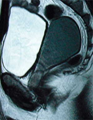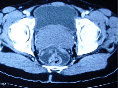 The mullerian duct cyst is a congenital condition represents remnant of the caudal ends of the fused müllerian duct, a structure that typically regresses in time. These cysts are typically located in the midline, behind the bladder, originating in the region urinary passage just below the level of prostate connected by a thin stalk. It is not associated with other congenital abnormalities of the urinary tract. The cystic fluid is devoid of sperms, and may be thick tenacious or sometimes blood stained. Rarely stones may occur within these cysts. It is common between 20 to 40 years.