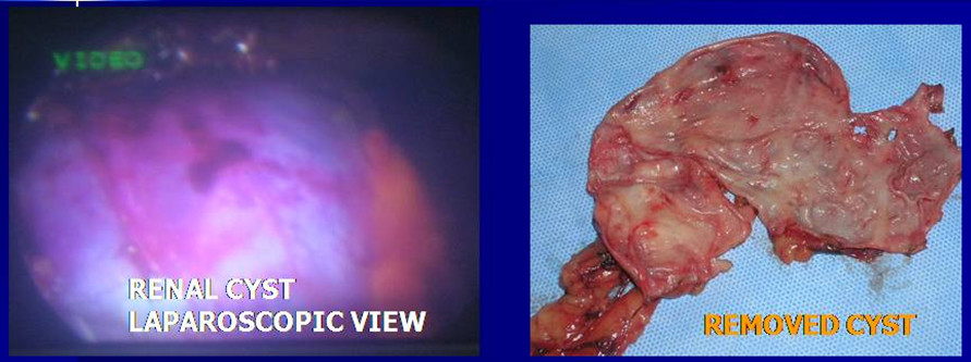 Small renal cysts are commonly seen on routine scan. They are harmless and only follow up is require annual follow up scan Larger cysts over 6 cm are prone to stone formation, cancer developing within it and may rupture causing acute pain. They are best removed laparoscopy. The cyst wall is removed completely and kidney is safeguarded.
